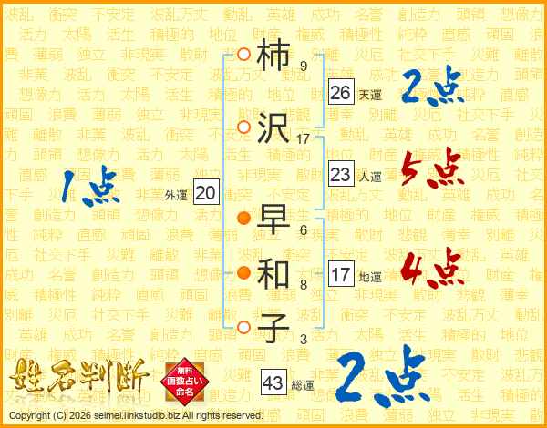 柿(9画)沢(17画) 早(6画)和(8画)子(3画)