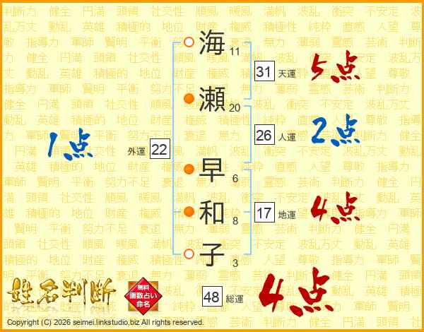 海(11画)瀬(20画) 早(6画)和(8画)子(3画)