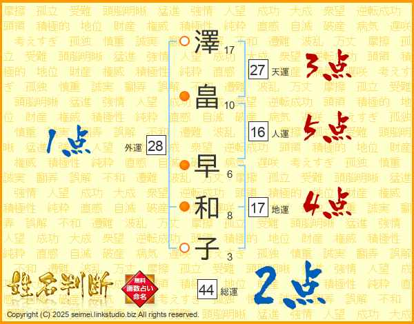 澤(17画)畠(10画) 早(6画)和(8画)子(3画)