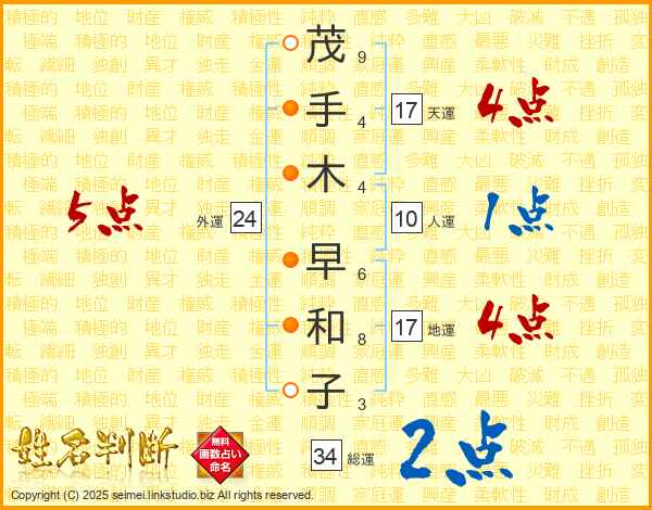 茂手木早和子さんの天運は17画の4点!