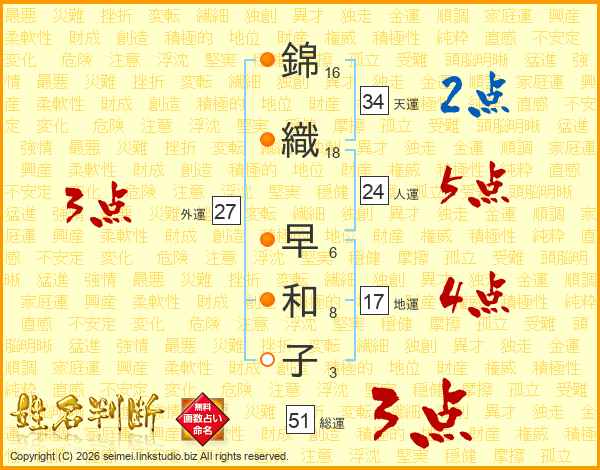 錦(16画)織(18画) 早(6画)和(8画)子(3画)