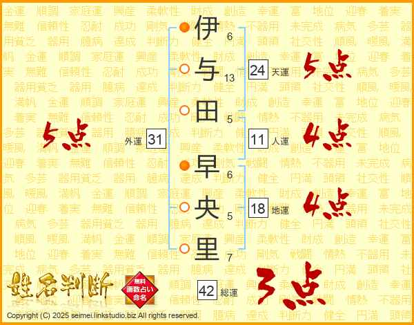 伊(6画)与(13画)田(5画) 早(6画)央(5画)里(7画)