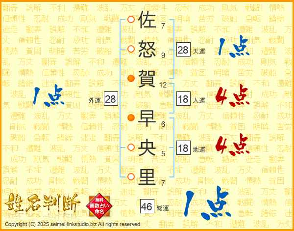佐(7画)怒(9画)賀(12画) 早(6画)央(5画)里(7画)