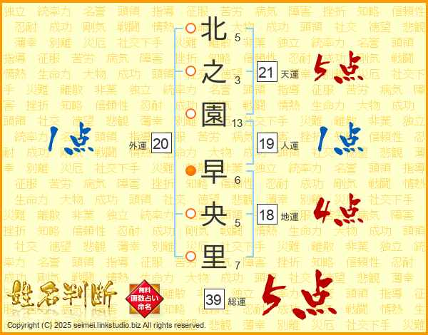 生活面を象徴する運勢です。外部から受ける影響力を表し、結婚運、家庭運や職場、環境への順応性を表します。総運から人運を引いた画数。姓や名が1文字の場合を除く。