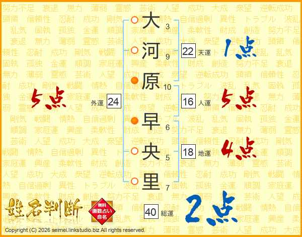 あなたの人生を表す1番重要な運勢です。生涯を通じて影響する総合運となり、主に50歳以降の晩年期に影響を及ぼします。苗字と名前の合計画数。