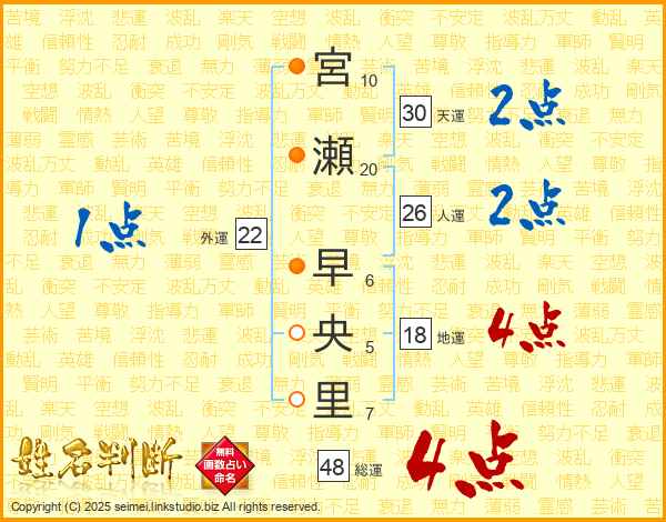 宮(10画)瀬(20画) 早(6画)央(5画)里(7画)