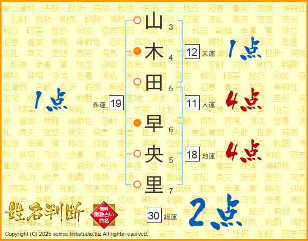 山(3画)木(4画)田(5画) 早(6画)央(5画)里(7画)