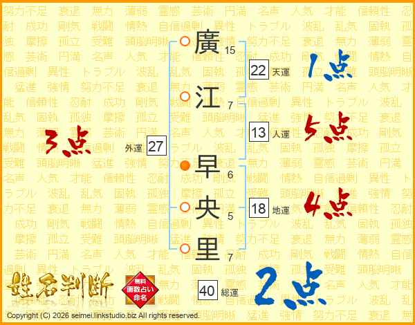 生活面を象徴する運勢です。外部から受ける影響力を表し、結婚運、家庭運や職場、環境への順応性を表します。総運から人運を引いた画数。姓や名が1文字の場合を除く。