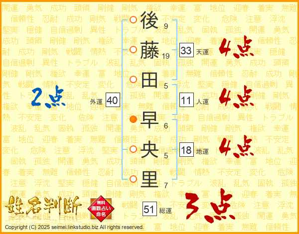 後(9画)藤(19画)田(5画) 早(6画)央(5画)里(7画)
