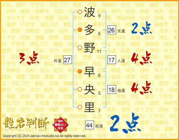 波(9画)多(6画)野(11画) 早(6画)央(5画)里(7画)