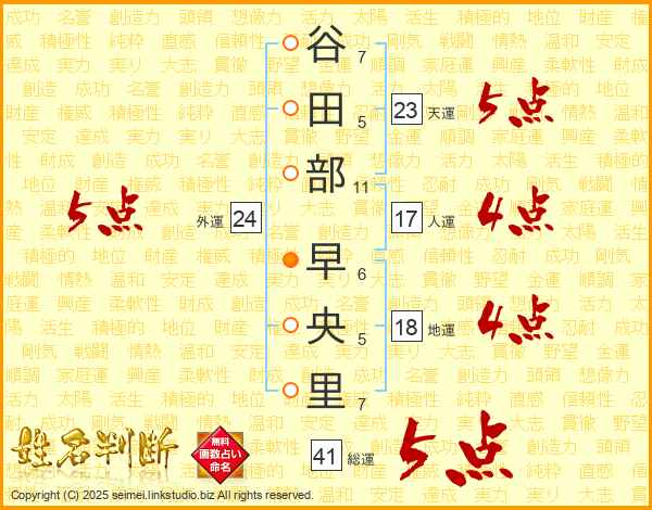 谷(7画)田(5画)部(11画) 早(6画)央(5画)里(7画)