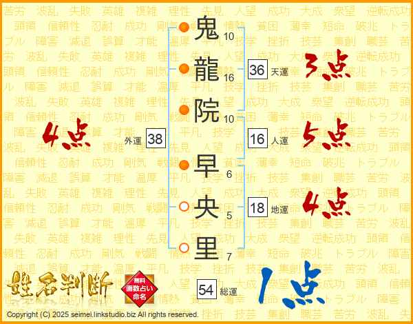 鬼(10画)龍(16画)院(10画) 早(6画)央(5画)里(7画)