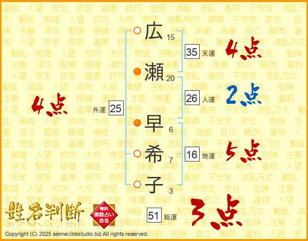広(15画)瀬(20画) 早(6画)希(7画)子(3画)