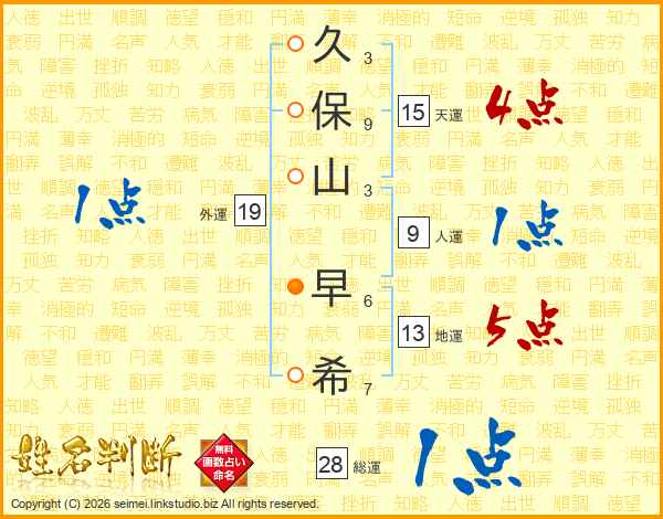久(3画)保(9画)山(3画) 早(6画)希(7画)