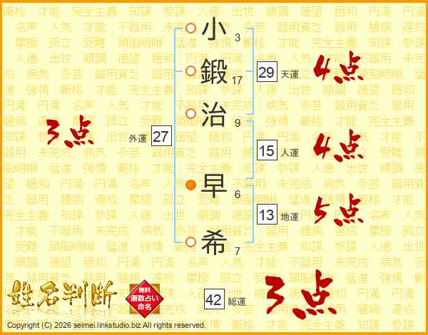 小(3画)鍛(17画)治(9画) 早(6画)希(7画)