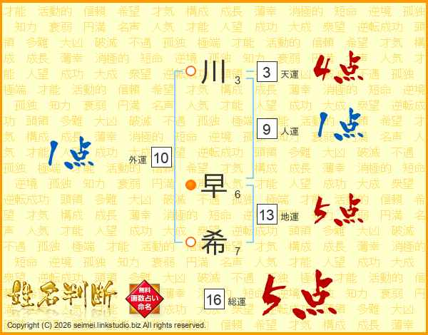 川(3画) 早(6画)希(7画)