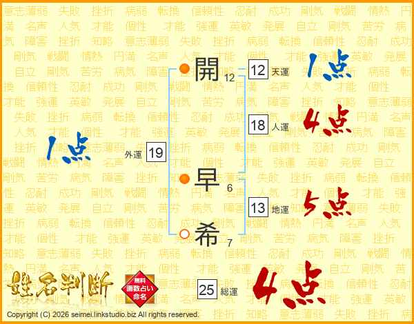 開(12画) 早(6画)希(7画)