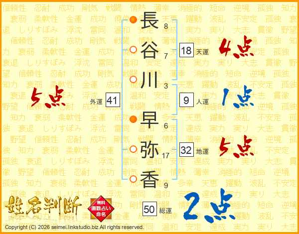 長(8画)谷(7画)川(3画) 早(6画)弥(17画)香(9画)