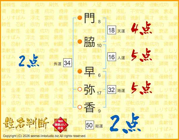 門(8画)脇(10画) 早(6画)弥(17画)香(9画)