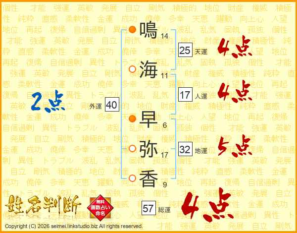 鳴(14画)海(11画) 早(6画)弥(17画)香(9画)