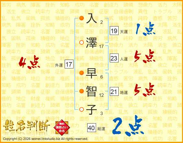 入(2画)澤(17画) 早(6画)智(12画)子(3画)
