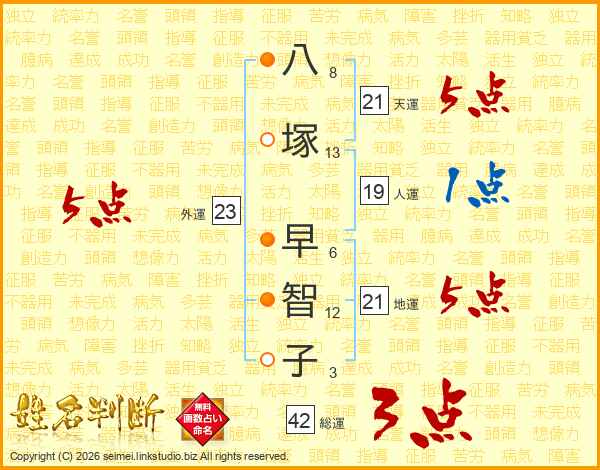 八(8画)塚(13画) 早(6画)智(12画)子(3画)