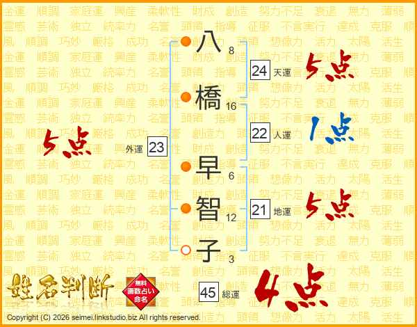 八(8画)橋(16画) 早(6画)智(12画)子(3画)