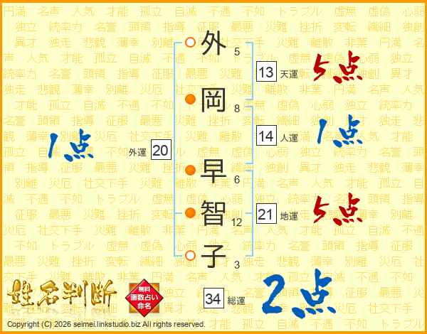 外(5画)岡(8画) 早(6画)智(12画)子(3画)