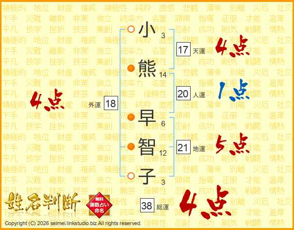小(3画)熊(14画) 早(6画)智(12画)子(3画)