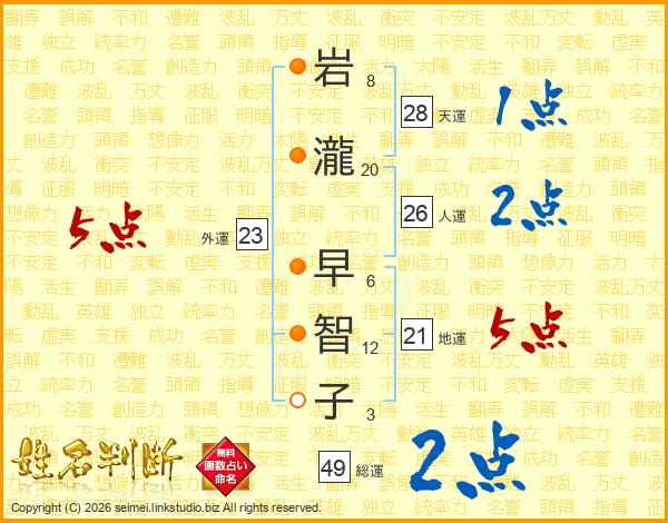 岩(8画)瀧(20画) 早(6画)智(12画)子(3画)