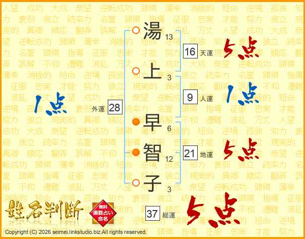 湯(13画)上(3画) 早(6画)智(12画)子(3画)