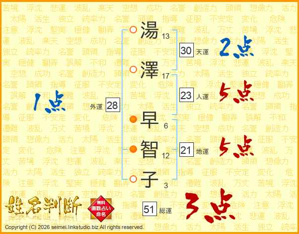 湯(13画)澤(17画) 早(6画)智(12画)子(3画)