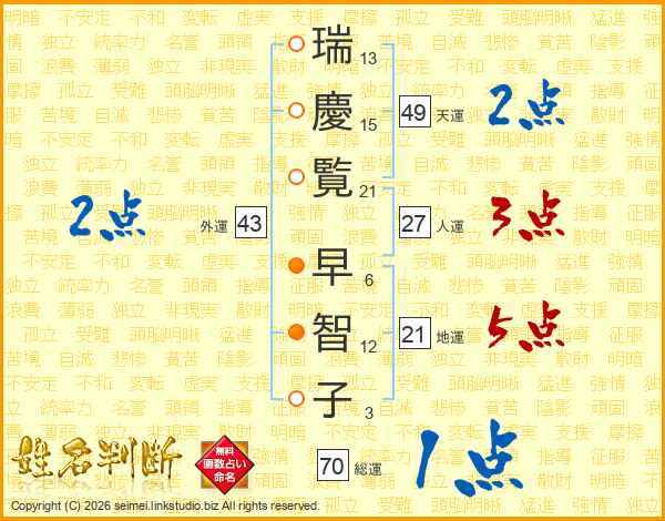 瑞(13画)慶(15画)覧(21画) 早(6画)智(12画)子(3画)