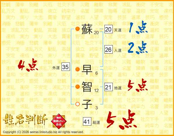 生活面を象徴する運勢です。外部から受ける影響力を表し、結婚運、家庭運や職場、環境への順応性を表します。総運から人運を引いた画数。姓や名が1文字の場合を除く。
