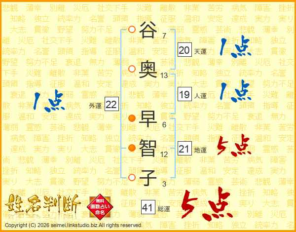 谷(7画)奥(13画) 早(6画)智(12画)子(3画)