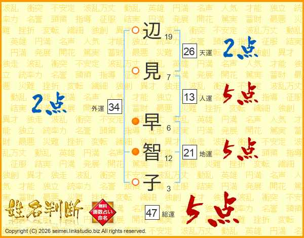 辺(19画)見(7画) 早(6画)智(12画)子(3画)