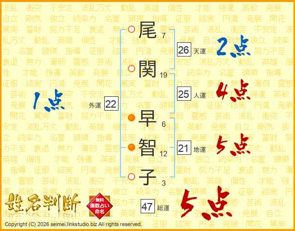 尾(7画)関(19画) 早(6画)智(12画)子(3画)