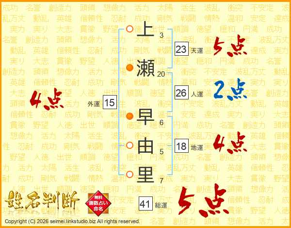上(3画)瀬(20画) 早(6画)由(5画)里(7画)