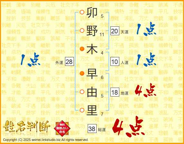 卯(5画)野(11画)木(4画) 早(6画)由(5画)里(7画)