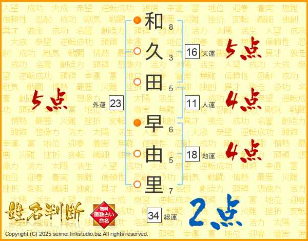 和(8画)久(3画)田(5画) 早(6画)由(5画)里(7画)