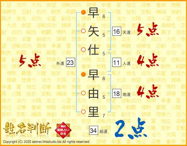 あなたの人生を表す1番重要な運勢です。生涯を通じて影響する総合運となり、主に50歳以降の晩年期に影響を及ぼします。苗字と名前の合計画数。
