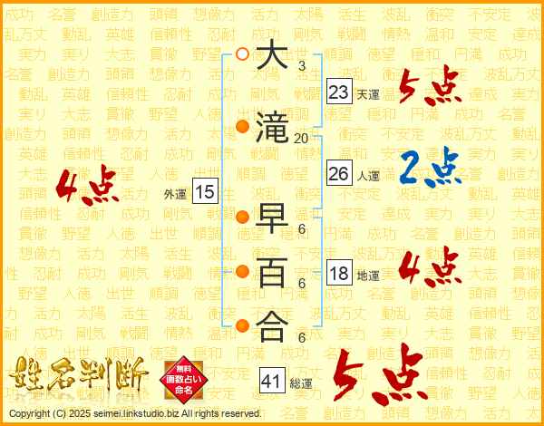 あなたの人生を表す1番重要な運勢です。生涯を通じて影響する総合運となり、主に50歳以降の晩年期に影響を及ぼします。苗字と名前の合計画数。
