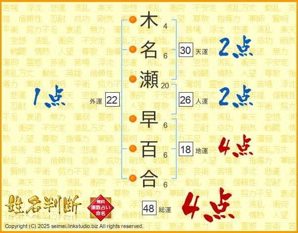 木(4画)名(6画)瀬(20画) 早(6画)百(6画)合(6画)