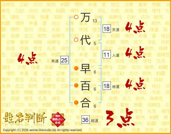 生活面を象徴する運勢です。外部から受ける影響力を表し、結婚運、家庭運や職場、環境への順応性を表します。総運から人運を引いた画数。姓や名が1文字の場合を除く。