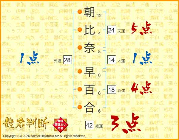 朝(12画)比(4画)奈(8画) 早(6画)百(6画)合(6画)