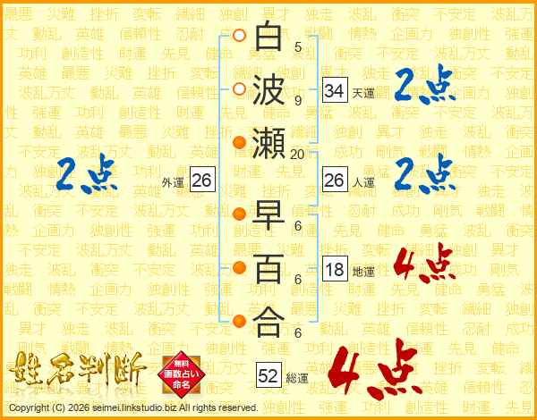 白(5画)波(9画)瀬(20画) 早(6画)百(6画)合(6画)