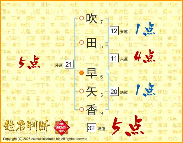 吹(7画)田(5画) 早(6画)矢(5画)香(9画)