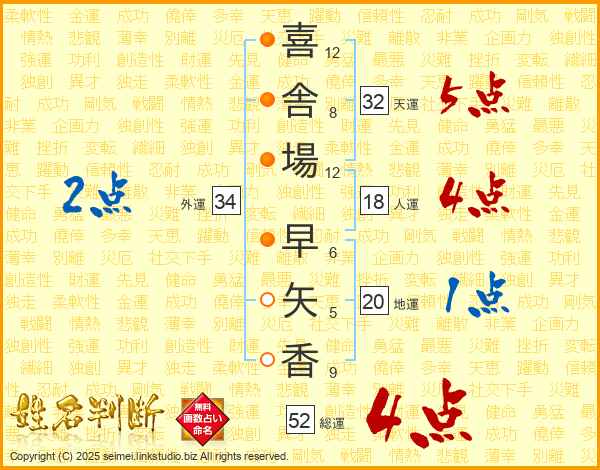 喜(12画)舎(8画)場(12画) 早(6画)矢(5画)香(9画)
