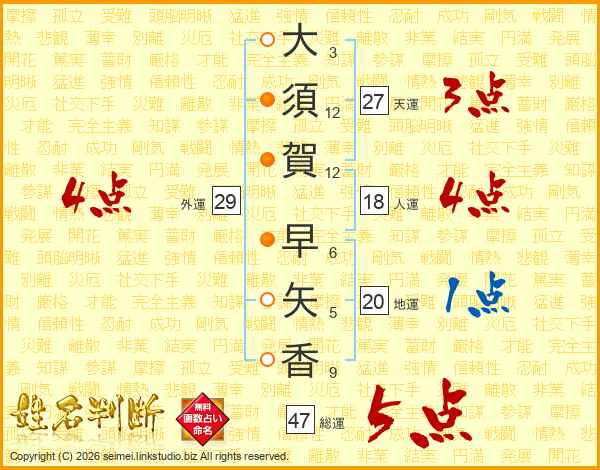 大(3画)須(12画)賀(12画) 早(6画)矢(5画)香(9画)