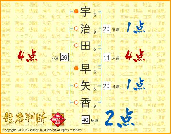 宇(6画)治(9画)田(5画) 早(6画)矢(5画)香(9画)